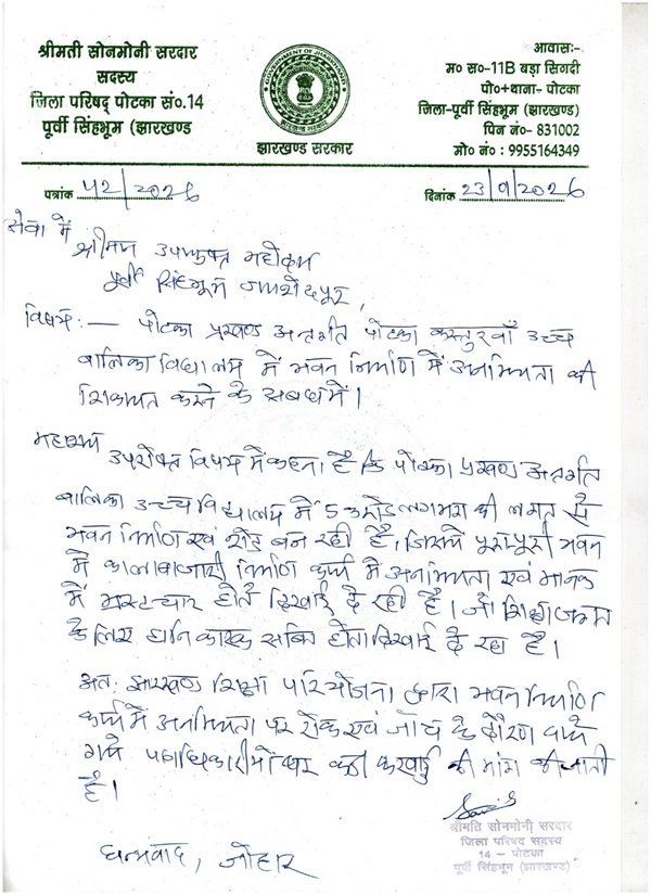 जादूगोड़ा : पोटका में विकास के नाम पर सरकारी राशि की लुट को लेकर महिला जिला परिषद सदस्य सोन मुनि सरदार ने आवाज उठानी तेज कर दी है। हालिया मामला पोटका प्रखंड क्षेत्र के कस्तूरबा बालिका उच्च विद्यालय के पांच करोड़ रुपये लागत वाले भवन निर्माण का है। सोन मुनि सरदार ने जिले के उपायुक्त को पत्र लिखकर भवन निर्माण में भारी अनियमितताओं और निर्धारित मानक नियमों की अनदेखी की जानकारी दी है। उन्होंने दोषी अधिकारियों के खिलाफ कठोर कार्रवाई की भी मांग की है। इस मामले में भाजपा नेता लव सरदार ने कहा कि पोटका में सरकारी योजनाओं में भ्रष्टाचार नई बात नहीं है और जांच होने पर विकास के नाम पर सरकारी राशि की लुट का मामला सामने आएगा।